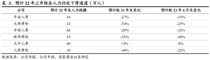 人力清虚影响下预计代理人规模仍面临较大幅度下滑,是个险新单下滑的主要原因。22年上市险企仍然延续较为严格的渠道清虚政策,导致全年人力规模仍然呈现较大程度的下滑。其中,上市公司清虚的节奏有所分化,前期寿险改革力度较大的公司在22年下半年人力下滑幅度有所收敛,比如太保寿险;而前期清虚力度较小的公司在22年下半年人力出现大规模退坡,比如新华保险。此外,太平人寿预计全年人力实现正增长,主要为与同业有较大的策略差距带来,预计公司仍然坚持原有的大力度费用投入带来的人力规模增长,但预计费用超支使得公司这一策略难以持续。我们预计22年末上市险企人力规模分别为:中国人寿(66万人)>平安人寿(44万人)>太平人寿(40万人)>太保寿险(24万人)>新华保险(19万人)>人保寿险(10万人)。