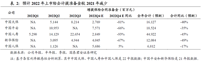 750日国债收益率曲线下行幅度收窄预计小幅缓解准备金计提压力,对利润增长有正向贡献。根据我们测算,截至2022年末750天国债收益率曲线为2.91%,全年下降13.8bp,相较2021年下降19.8bp收窄6.0bp。根据各家公司披露的利率敏感性分析,剔除前三季度已计提的准备金后,预计22年四季度各家公司仍将计提保险合同准备金为:中国太保(27.69亿元,同比-81%)<中国人寿(28.49亿元,同比-93%)<新华保险(40.45亿元,同比-67%)<中国人保(56.86亿元,同比+5%)<中国平安(75.71亿元,同比-66%);预计全年准备金计提同比均有所下降,分别为:新华保险(-49%)<中国人寿(-45%)<中国太保(-40%)<中国平安(-35%)<中国人保(-17%)。