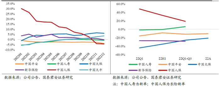 2)个险续期受制于渠道改革导致的代理人清虚,原先低质量人力为获取佣金套利而大量购买的自保件面临集中退保,导致个险续期增长承压。22年上市险企已披露的续期分别为:平安寿险(-1.3%)>太保寿险(-3.6%)。