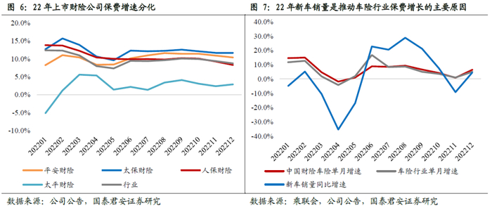 疫情封控对车险增长有阶段性冲击,新车消费刺激政策带来的新车销量景气是推动车险增长的主要驱动力。随着车险综改对车均保费的一次性影响的消除,22年车险的车均保费总体平稳,新车销量是车险保费增长的主要驱动力。22年车险保费增速月度间波动明显,主要受到疫情和新车消费刺激政策两大影响。其中二季度和四季度受到疫情封控的影响,新车销量放缓导致车险增速承压;而三季度明显的新车消费刺激政策带来新车销量的高景气,有效推动车险较快增长。22年上市险企车险保费增速分别为:太保财险(+6.7%)>平安财险(+6.6%)>人保财险(+6.2%)。