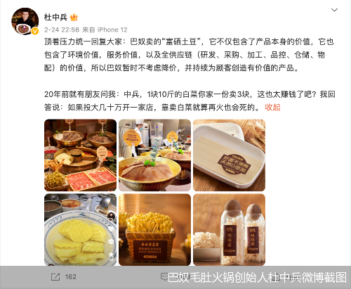 杜中兵在社交平台上表示,巴奴卖的“富硒土豆”不仅包含了产品本身的价值,也包含了环境价值、服务价值以及全供应链中研发、采购、加工、品控、仓储、物配的价值,所以巴奴暂时不考虑降价。同时,杜中兵还进行了举例,似乎希望以白菜的例子来类比“富硒土豆”。早在20年前,杜中兵的朋友就称1元10斤的白菜巴奴一份卖3元太赚钱,而杜中兵则回答,如果投大几十万开一家店,靠卖白菜就算再火也会死的。