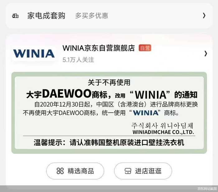 与此同时,WINIA店铺客服则对北京商报记者表示:2020年12月31日前,两个品牌为同一家公司持有,因公司策略调整,2020年12月31日后“大宇DAEWOO壁挂洗衣机”正式更名为“WINIA壁挂洗衣机”,洗衣机为韩国原装进口,品质相同,因此,“大宇DAEWOO壁挂洗衣机”不再使用韩国原装进口产品,产品为国内加工生产。