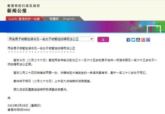 据香港特区政府新闻网消息,警方今日(2月26日)暂控两名年龄分别为31岁及65岁的男子合共一项谋杀罪及一名63岁女子一项妨碍司法公正罪。