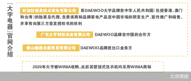 为何家喻户晓的大宇家电如今差评不断,北京商报记者在“大宇电器”的官网发现,其公司介绍写到:好加好信息技术家电有限公司系DAEWOO大宇品牌在中华人民共和国(包括香港、澳门和台湾)的独家总代理,负责该商标品牌家电产品在中国市场的研发生产、宣传推广和销售,并享有向第三方签发授权书的权利。广东大宇科技实业有限公司作为DAEWOO品牌在中国的合作方、佛山顺德启泰贸易有限公司作为DAEWOO品牌进出口业务方。