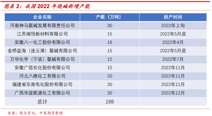 由于下游需求的不断扩张,目前烧碱行业产能仍在缓慢增长中。2022年烧碱新增产能计划近250万吨,但受宏观经济下滑以及疫情的扰动,实际投产不及预期,最终有188万吨产能投产。2022年未投产延后计划以及2023年新增投产计划产能有300万吨以上,实际投产情况还要继续跟进。2023年投产计划中规模在30万吨以上的有5家,主要分布在华北、华东以及西北地区。