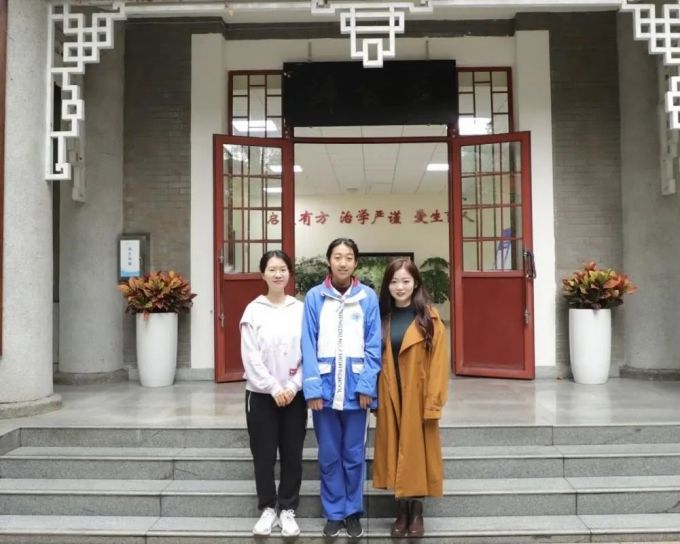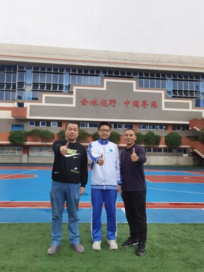 ▲高2021级13班饶轶琨(中)与班主任郑文书(右)、指导老师徐珂(左)合影