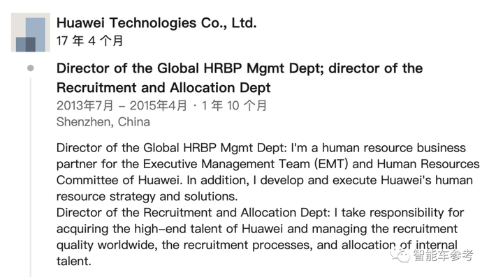 后2年时间,也就是从2013年7月开始,他担任华为总部全球招聘和调配负责人,兼任华为全球HRBP管理部负责人。