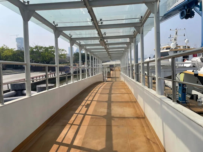值得一提的是,记者注意到,在联检楼二楼和三楼的免税店正在装修,码头上也已有两艘客船停靠于泊位。据悉,广州琶洲港澳客运口岸所用船为碳纤维高速双体客船。全船有旅客座位260个,头等舱60个、普通舱200个,内设免税品售卖处。
