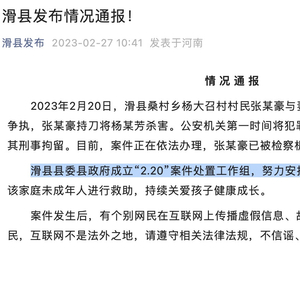 2月27日,“滑县发布”微信公众号发布情况通报,2023年2月20日,滑县桑村乡杨大召村村民张某豪与妻子杨某芳因家庭矛盾纠纷发生争执,张某豪持刀将杨某芳杀害。公安机关第一时间将犯罪嫌疑人张某豪控制,并依法对其刑事拘留。目前,案件正在依法办理,张某豪已被检察机关批准逮捕。