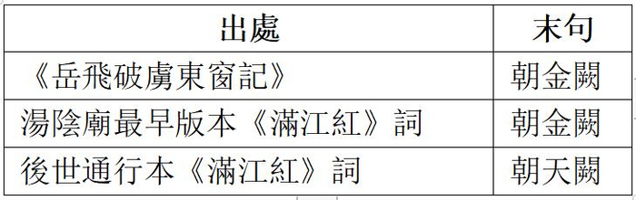 若不对读《岳飞破虏东窗记》中相关的曲词,不大容易理会这个最初版本中的“朝金阙”同后世通行本的“朝天阙”有什么区别(作为异体字,汤阴岳庙石碑本《满江红》词,还把“凭栏处”的“栏”字写成了“阑”形,“飢餐”的“飢”字寫成了“饑”形),但一相对比,就会看到一个文句演变的序列: