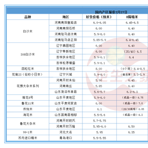 2月27日,辽宁阜新地区308白沙统米收6.0左右,8个筛6.4左右,35/40规格米6.5左右,花育23(俗称小日本)混米5.9左右,价格上涨,基本不上货,交易不多。