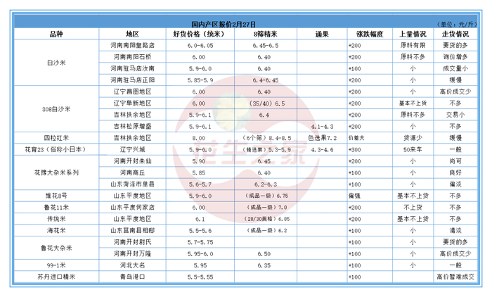 2月27日,河南省南阳市石桥镇白沙通货米收6.0,8个筛上卖6.4,7个筛上卖6.3,手捡瓣卖5.6,吉林省扶余市弓棚子308通货收6.0,8个筛卖6.4,7个筛6.3,35/40规格米6.5,光头半米卖5.8,百姓惜售,基本不上货,价格上涨。