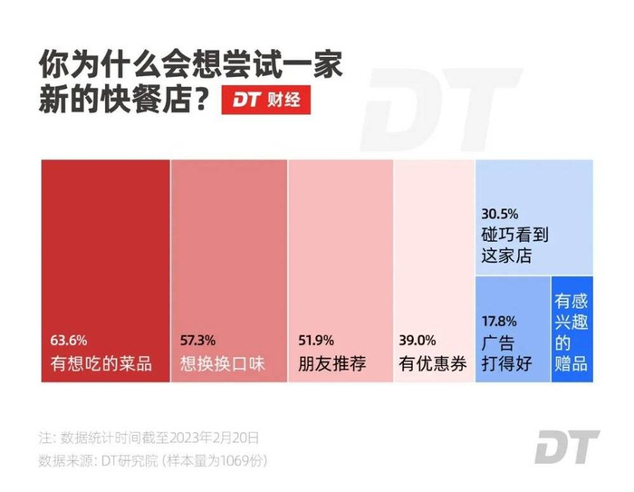 当快餐店不只为满足人们的功能性需求——快速填饱肚子就行——还要给人们带来美食的享受时,超过6成人会被菜品吸引而尝试一家新店,其次是为了换换口味。