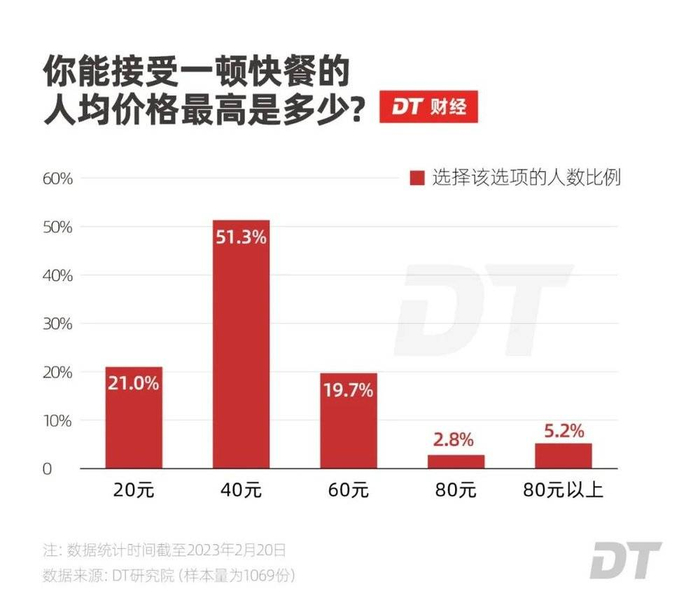 与此同时,人们给快餐的预算也侧面佐证了快餐的正餐化。仅2成人的快餐预算只有20元,超过一半的人愿意花40块钱吃快餐,甚至有人接受每顿为了快餐花80元以上。