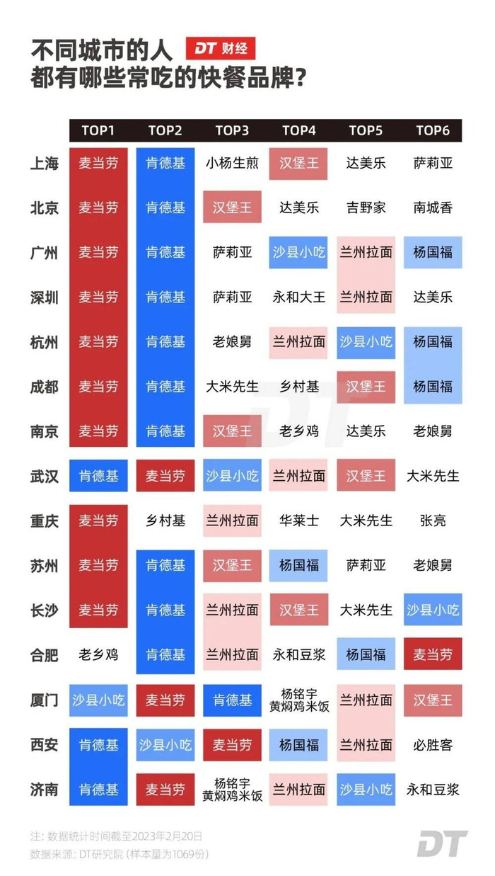一些本土餐饮品牌在发源地及周边地区势头凶猛,乡村基在重庆的热门程度超过肯德基,排名第二;合肥品牌老乡鸡甚至超越了两大洋快餐,成为当地第一;在厦门,人们最常吃的快餐也并非汉堡薯条,而是沙县小吃。