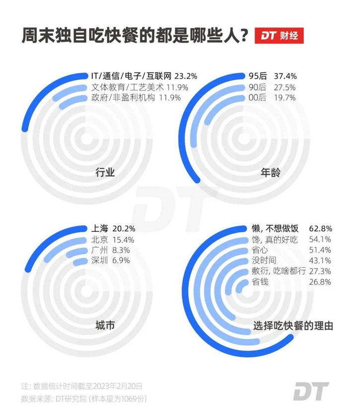 更具体来看,一个人在周末也要吃快餐的人,以生活在上海和北京的95后、90后为主,尽管懒得做饭,但他们不愿意在吃的方面将就,而快餐刚好可以满足味蕾的享受,于是一个人的周末,他们也愿意美滋滋吃个快餐。