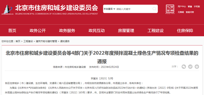 北京市住房和城乡建设委员会等4部门关于2022年度预拌混凝土绿色生产情况专项检查结果的通报