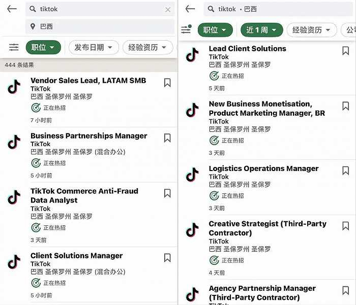 与此同时,去年10月传出的TikTok Shop巴西站将在2023年上半年开放的消息,也在TikTok的最新招聘信息中心得到一些侧面佐证。亿邦动力发现,截止到2月10日的一周内,TikTok至少发布了40多个巴西的职位,其中包含了物流主管、电商顾问、电商-人力资源管理项目经理、电商-内容及创作者治理负责人等多个与电商业务相关的职位。