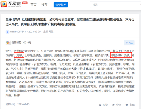 香雪制药23日表示,公司产品:香雪抗病毒口服液具有清热祛湿,凉血解毒功效,临床上广泛用于治疗感冒、流感、上呼吸道感染、腮腺炎、病毒性结膜炎、手足口病等疾患。在抗击非典、甲型H1N1流感、禽流感、新冠肺炎疫情期间发挥了重要作用。“面对市场对公司产品的需求,公司会全力以赴供应。”