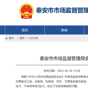 通告称,根据《中华人民共和国食品安全法》及其实施条例等有关规定和泰安市2023年“食安护佳节”食品安全专项监督抽检计划安排,市场监管部门对粮食加工品、肉制品、乳制品、饮料、方便食品速冻食品、薯类和膨化食品等14大类食品100批次样品进行了监督抽检,抽检检验项目合格样品97批次,不合格样品3批次。检出了农药残留超标问题。