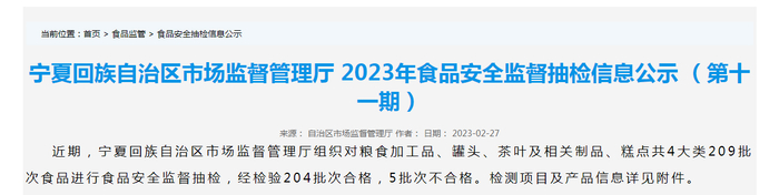 中国质量新闻网讯 2023年2月27日,宁夏回族自治区市场监督管理厅网站公示2023年食品安全监督抽检信息(第十一期)。本期抽检粮食加工品、罐头、茶叶及相关制品、糕点共4大类209批次食品,经检验204批次合格,5批次不合格。