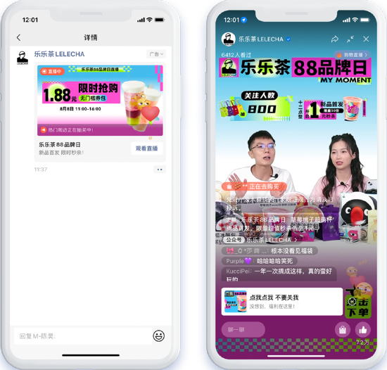 新式茶饮品牌乐乐茶就抓住88品牌日这一关键营销节点,在品牌全面升级及新品推广之际,将视频号直播作为潜力渠道,通过公域广告引流+视频号直播的一站式运营链路,用公域流量放大单场品牌直播的效能,为乐乐茶88品牌日活动带来全网流量曝光,实现声量与销量双增长。