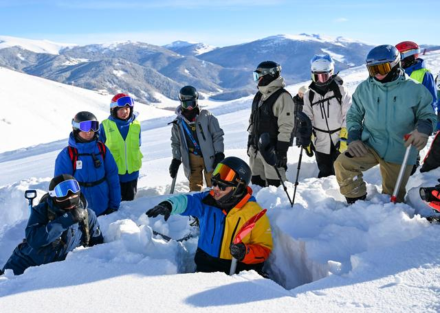 在新疆阿勒泰地区禾木吉克普林滑雪场,滑雪爱好者彭超(前)为雪友和雪场救援队分析雪层特点(2023年1月13日摄)。新华社记者 胡虎虎 摄