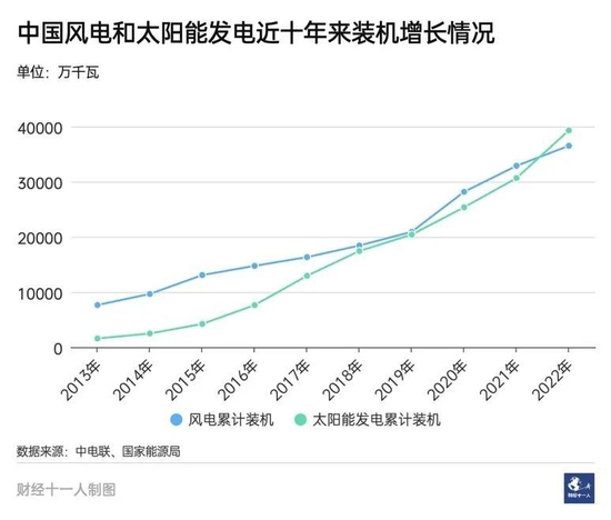 在可再生能源领域,风电装机量一直都领先于太阳能发电;2022年,两者位置互换,中国太阳能发电装机量首次超过了风电。