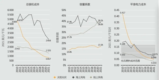 全球光伏、陆上和海上风电的成本下降(2010-2021年)