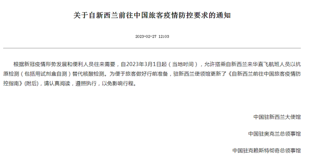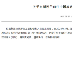 根据新冠疫情形势发展和便利人员往来需要,自2023年3月1日起,允许搭乘自新西兰和马来西亚来赴华直飞航班人员以抗原检测(包括用试剂盒自测)替代核酸检测。