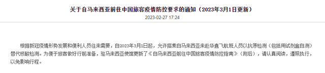 中国驻新西兰大使馆和中国驻马来西亚大使馆网站2月27日分别发布关于自新西兰和马来西亚前往中国旅客疫情防控要求的通知: