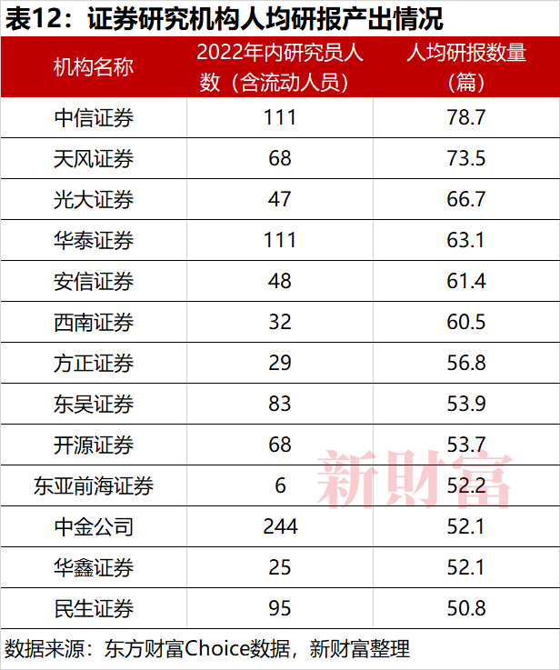 从证券研究机构看,2022年,人均研报数量超50篇的研究所达13家。其中,中信证券人均产出研报数量达78.7篇,居券商首位,这意味着,每4-5天便有一篇研报被生产出来(表12)。头部券商如中金公司、中信证券等均保持着较高的产出。