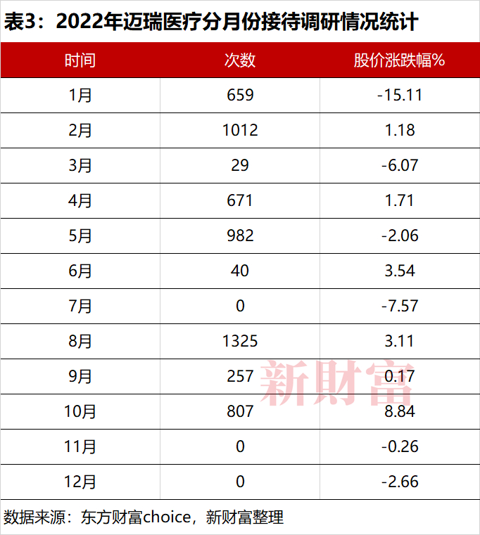 2022年2月、5月、8月,迈瑞医疗接待机构调研次数明显高于其他月份。其中,4月与8月分别是其公布年报与半年报的时间节点,不难发现,机构对迈瑞医疗的调研时间主要集中在财报披露或股价出现明显波动后(表3)。从调研内容来看,其受集采影响程度、业绩增长目标等成为机构关注的焦点。