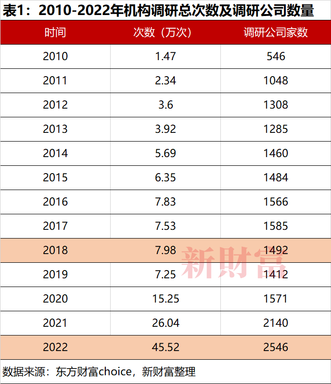 2022年,机构调研累计达45.52万次,同比增长74.81%;覆盖2546家公司,占2022年A股上市公司总数约50%,同比上涨18.97%,其中,约78家上市公司获机构超千次调研,16家公司接受调研次数在2000次以上。