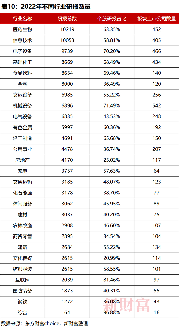 分行业看,在东方财富27个一级行业中,医药生物、信息技术、电子设备、基础化工、食品饮料成为2022年研报产出数量较多的行业,这与2021年基本保持一致。这一方面因为,这些行业上市公司数量相对丰富;另一方面,这也显示了机构对大科技、大消费等板块的偏爱(表10)。