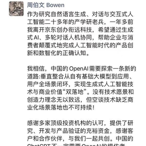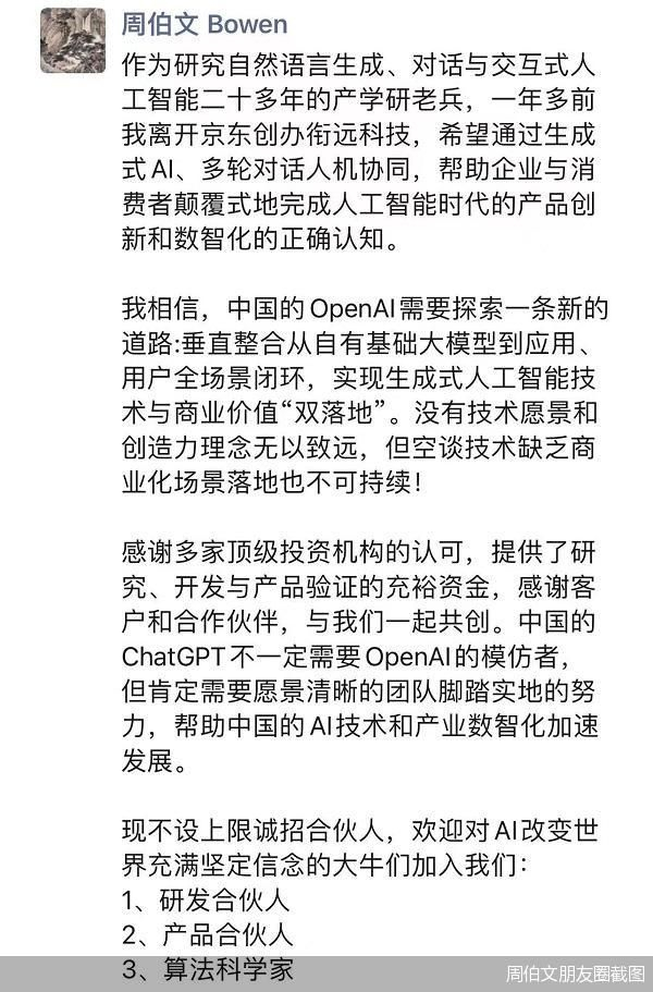 和王慧文的英雄榜相比,周伯文的措辞更加技术范。他先秀出“研究自然语言生成、对话与交互式人工智能20多年的产学研老兵”的资历,再表明态度:“中国的OpenAI需要探索一条新的道路:垂直整合从自有基础大模型到应用、用户全场景闭环,实现生成式人工智能技术与商业价值‘双落地’”,然后展示资金实力:顶级投资机构提供了研究、开发和产品验证的充裕资金。