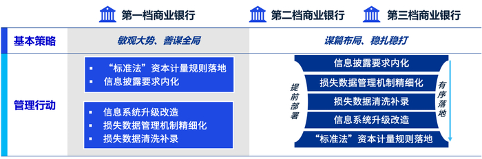 从合规达标角度,处于不同档位的商业银行其紧迫性各有差异,结合资本精细化管理、经营管理提升要求,各档位商业银行应采取差异化的应对策略,具体如下: