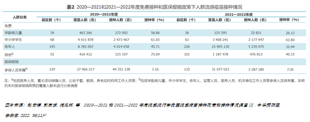 第一财经注意到,中疾控相关研究人员日前在《中华预防医学杂志》上,发表了一篇对两个流行季我国流感疫苗接种政策和接种情况的调查报告,数据显示2020—2021和2021—2022年度,我国流感疫苗接种率分别为3.16%和2.47%。其中,2021—2022年度,在免费接种人群中,中小学学生接种率达到62.8%,但老年人接种率仅为32.94%。