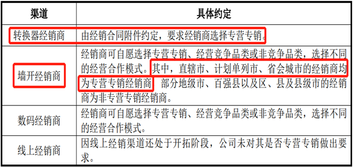 而根据公牛对经销商的管理约定,转化器经销商要求全部选择专营专销,墙开(墙壁开关)经销商则要求直辖市,计划单列市、省会城市的经销商为专营专销,数码经销商可自愿选择专营专销。