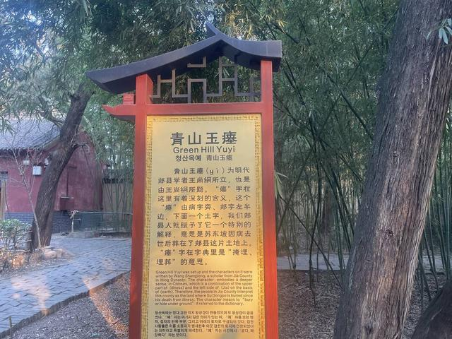 入远门进去迎面可见一个高大的青石牌坊,楣端刻的是明代郏县学者,官任浙江右布政史的王尚絅所题的“青山玉瘞”四字。“瘞”字生僻,是何意?“瘗”字在字典里也有“掩埋、埋葬”的意思。而且这个“瘞”由病字旁、郏字左半边,下面一个土字,郏县人赋予了它一个特别的解释,意思是苏轼因病去世后葬在了郏县这片土地上。