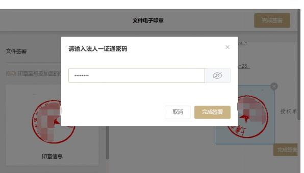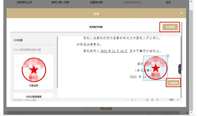 拖拽企业的电子印章到授权委托书的具体位置,点击“完成签署”进行法人确认,完成授权。
