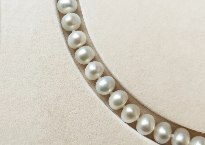 为了保证珍珠间距均匀,不易产生磨损,项链都是手工打结。