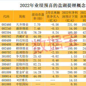 数据宝统计,根据业绩快报、预告净利润下限计算,已公布业绩数据的概念股中,近六成净利润为预增或扭亏状态。天齐锂业、盛新锂能、比亚迪、西藏矿业、科达制造5股净利润预增幅度超过3倍。