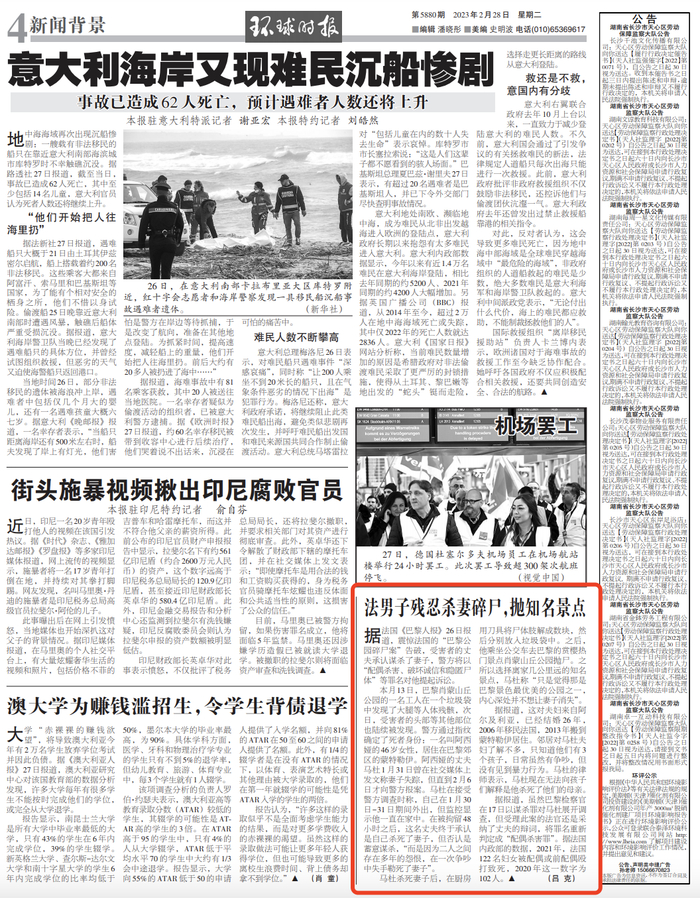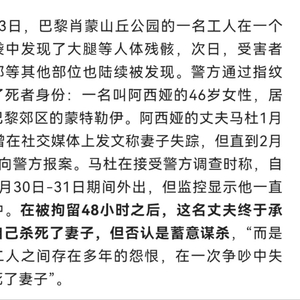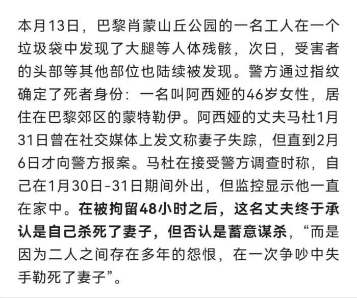 26日,据报道,震惊法国的“巴黎公园碎尸案”告破,受害者的丈夫承认谋杀了妻子,警方将以“配偶杀害、破坏诚信和隐匿尸体”等罪名对他提起诉讼。