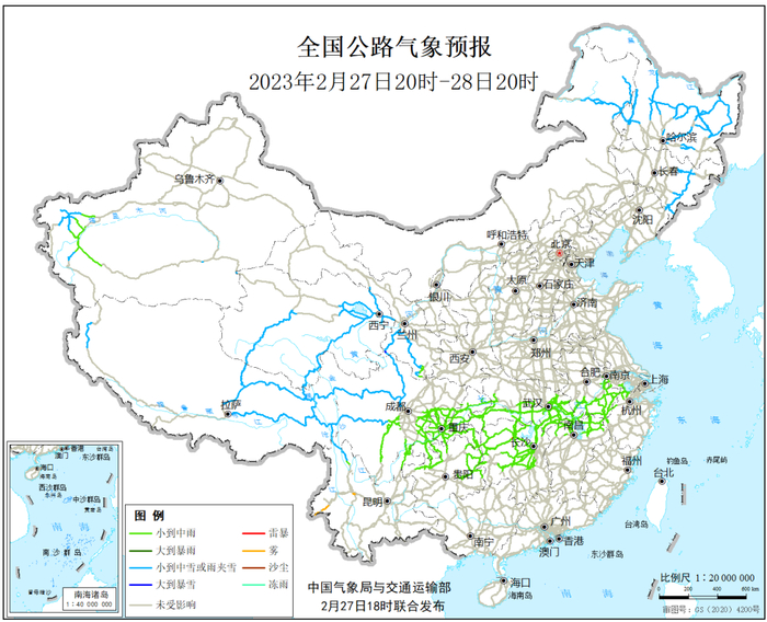 2月27日20时至28日20时,内蒙古东部、黑龙江大部、吉林东部、新疆南疆盆地、西藏东部、青海大部、甘肃东部等地部分地区有小到中雪或雨夹雪,其中,青海东南部、甘肃南部等地部分地区有大雪。西藏东南部、四川南部、重庆、贵州北部、湖北南部、湖南中部和北部、江西北部、安徽南部等地部分地区有小雨。另外,湖南北部、云南西部等地局地有雾。