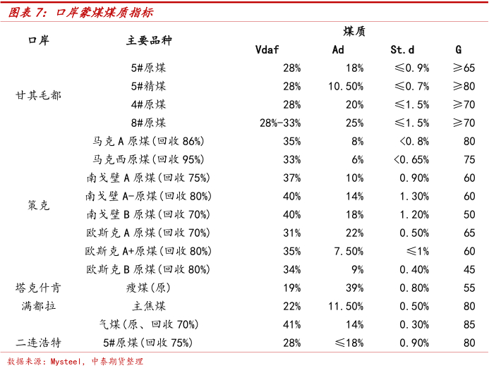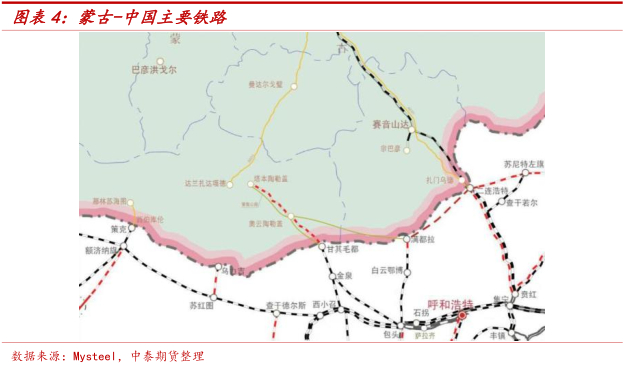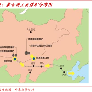 现在中蒙共有18个边境口岸,是我国向北开放的前沿。其中二连浩特是公路/铁路双用口岸,其余均是公路口岸。对蒙古国来说,有煤炭出口的主要口岸有5个,由西向东分别是塔克什肯、策克、甘其毛道、满都拉和二连浩特,潜在的煤炭出口口岸是东部的阿尔山口岸。其中出口量最大的是策克和甘其毛都口岸。据统计,中国进口蒙古煤炭主要通过策克口岸和甘其毛道口岸。甘其毛都主要以主焦煤为主,而策克口岸则以1/3焦煤为主。
