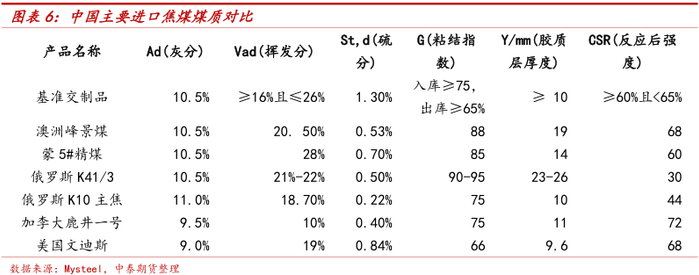 煤质方面,蒙古煤的特点是低硫低灰易洗选。原煤硫分1.0以下的比较多,大多数都不超1.5,原煤灰分一般在20以内,洗选回收率一般在80%以上。与其他进口煤种相比,从品质上来看,蒙古#5精煤是最接近当前大商所焦煤交割指标的品种,同时也最具有交割经济性。质量上看,蒙煤、澳煤都是优质煤种,都满足大商所交割要求。对比澳煤,蒙5#精煤硫分稍高,粘结指数稍低,对比澳煤整体质量稍次。
