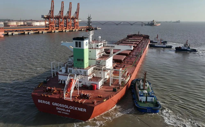 1月18日,一艘轮船在拖轮协助下向唐山港曹妃甸港区矿石码头靠泊(无人机照片)。