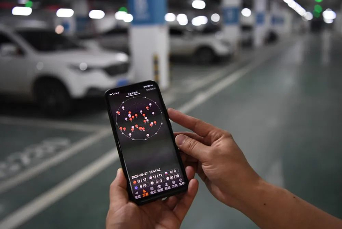 工作人员在雄安新区容东片区一地下车库展示“5G+北斗”大区域地下空间导航定位技术(2022年5月27日摄)。
