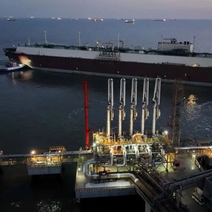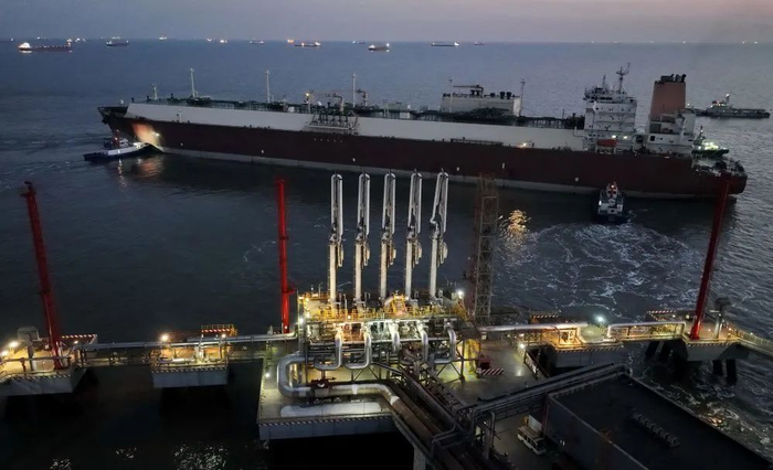 1月10日,一艘LNG船在唐山港曹妃甸港区中石油液化天然气接收站码头卸载后离港(无人机照片)。